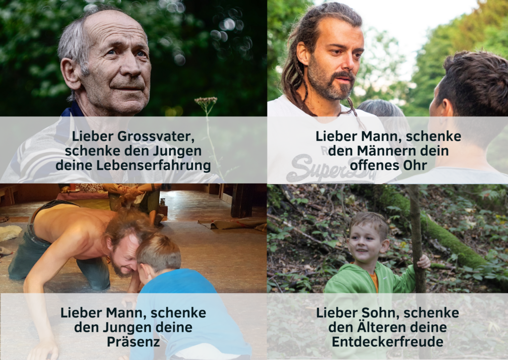 Auch wenn Du nur ohne Deinen leiblichen Sohn, Vater oder Grossvater kommen kannst oder wenn Du gar keinen hast, dann bist Du hier dennoch herzlich willkommen, wenn Du Dich gerufen fühlst. Bringe mit, was Du zu schenken hast. Und erhalte, was Dir geschenkt wird.